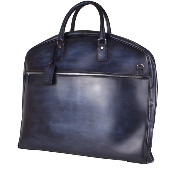 The suit bag is made of refined calfskin coloured and polished by hand in ocean blue tone with zip closure and double handles.