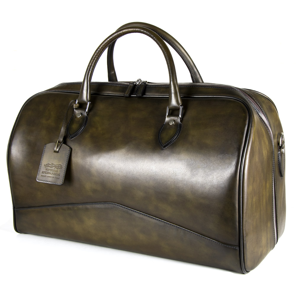 The travel bag is made of refined calf leather with antique colouring by hand in ortica green tone. Zip closure, sturdy leather handles and adjustable shoulder strap make the bag stylish and useful. L: 55 cm H: 34 cm W: 26 cm
