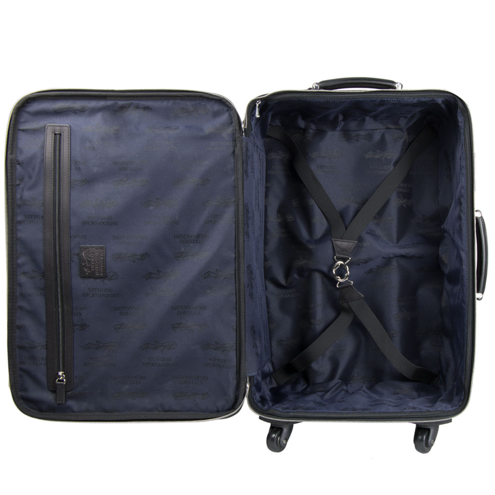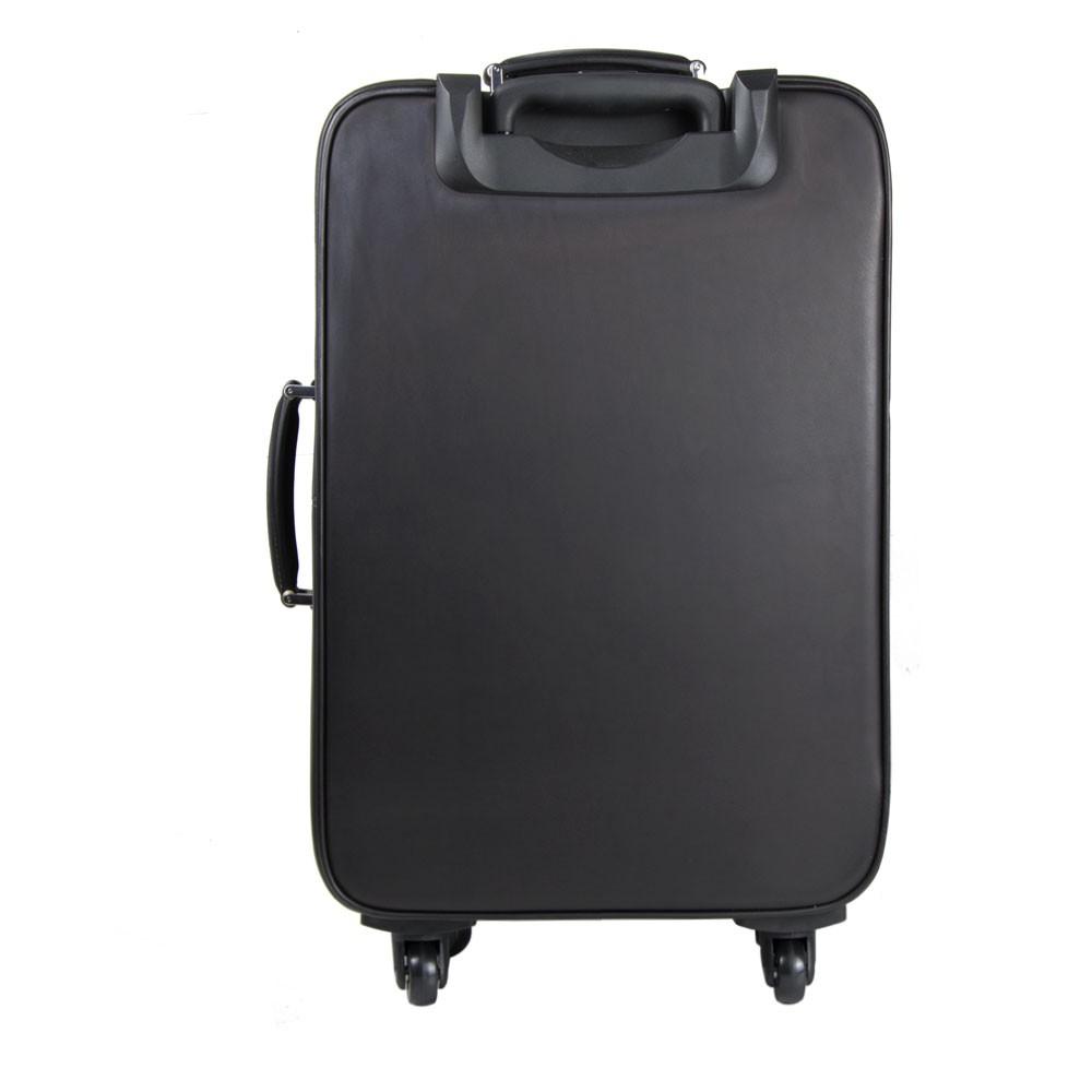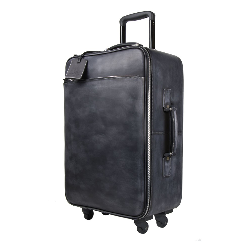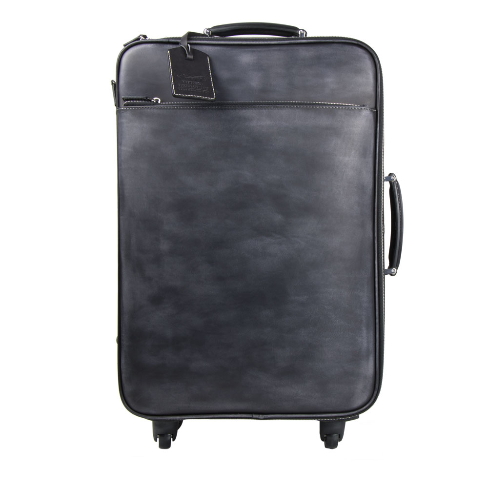 Comfortable and practical trolley for traveling with style. Its soft and elegant lines make it an ideal accessory for the most demanding travelers. With four multi-directional wheels, two comfortable leather handles and an ergonomic 3-length telescopic handle. Front pocket and closures with double bi-directional zip. Made with the finest quality hand-aged calf leather in shades of black. Dimensions L: 38 cm H: 60 cm W: 20 cm