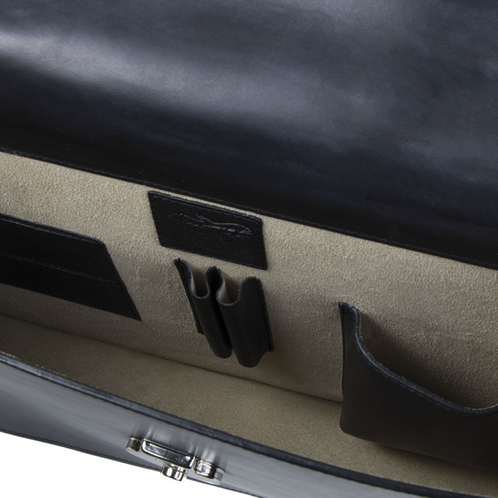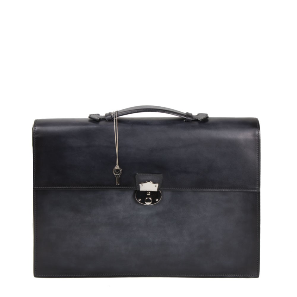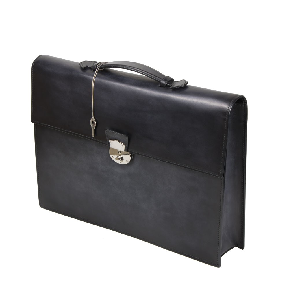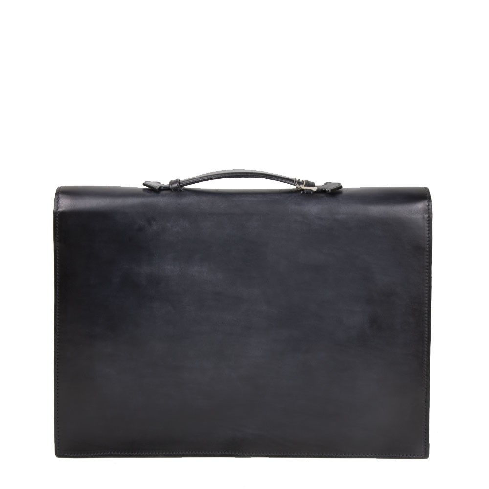 Lightweight briefcase made in soft calfskin leather hand antiqued and polished in shades of black. Closing with insert and push-button chromed, with the addition of a small safety key. Interior with pen holder, smartphone section and small card holder. Dimensions L: 38 cm H: 26 cm W: 8 cm 100% Made in Italy.