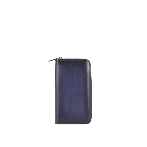 The vertical wallet with zip closure is made of calf leather. The unique ocean blue colour is created by hand-colouring and hand-polishing.