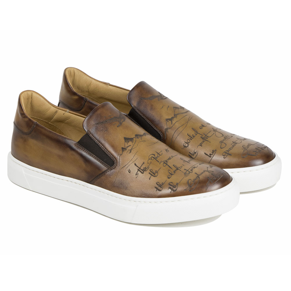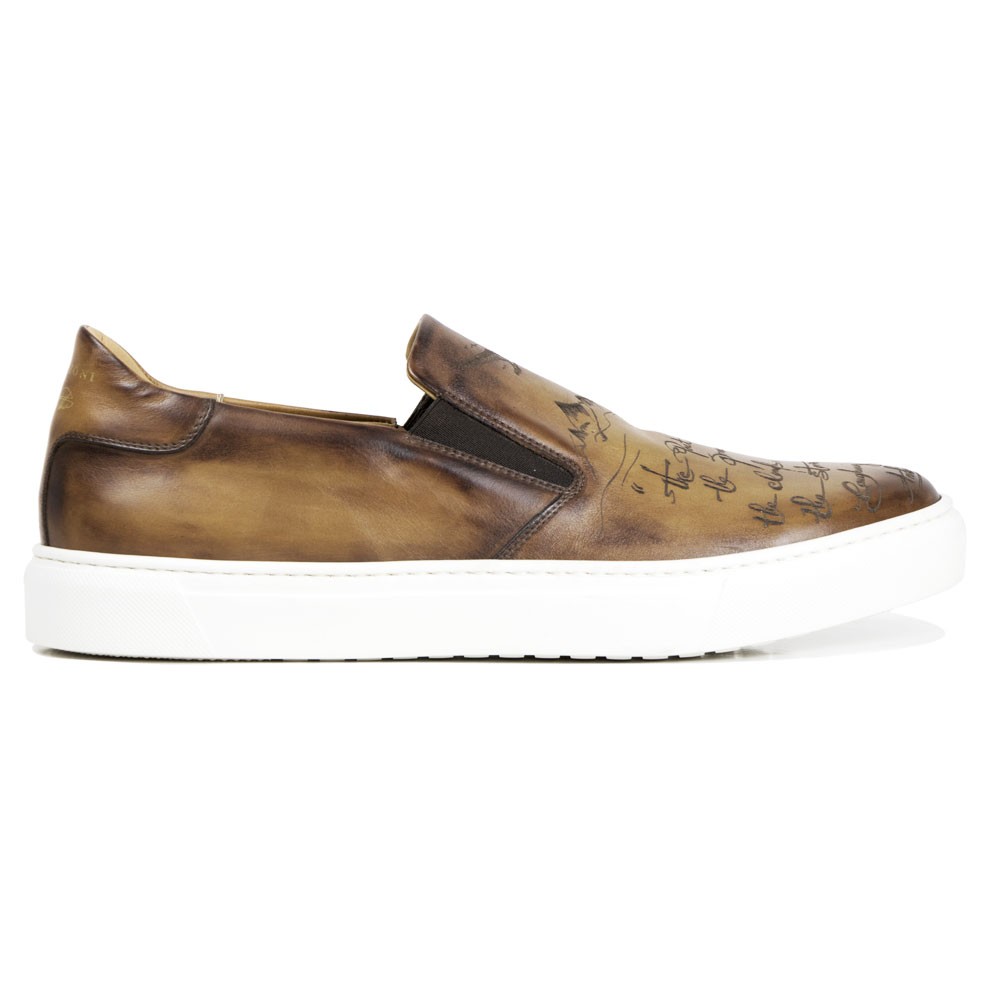 Slip on in ambra calfskin leather, engraved and entirely handmade antiqued. Rubber sole and AGO construction. The sporty design and refined makes this versatile sneaker ideal for casual wear. Made in Italy.
