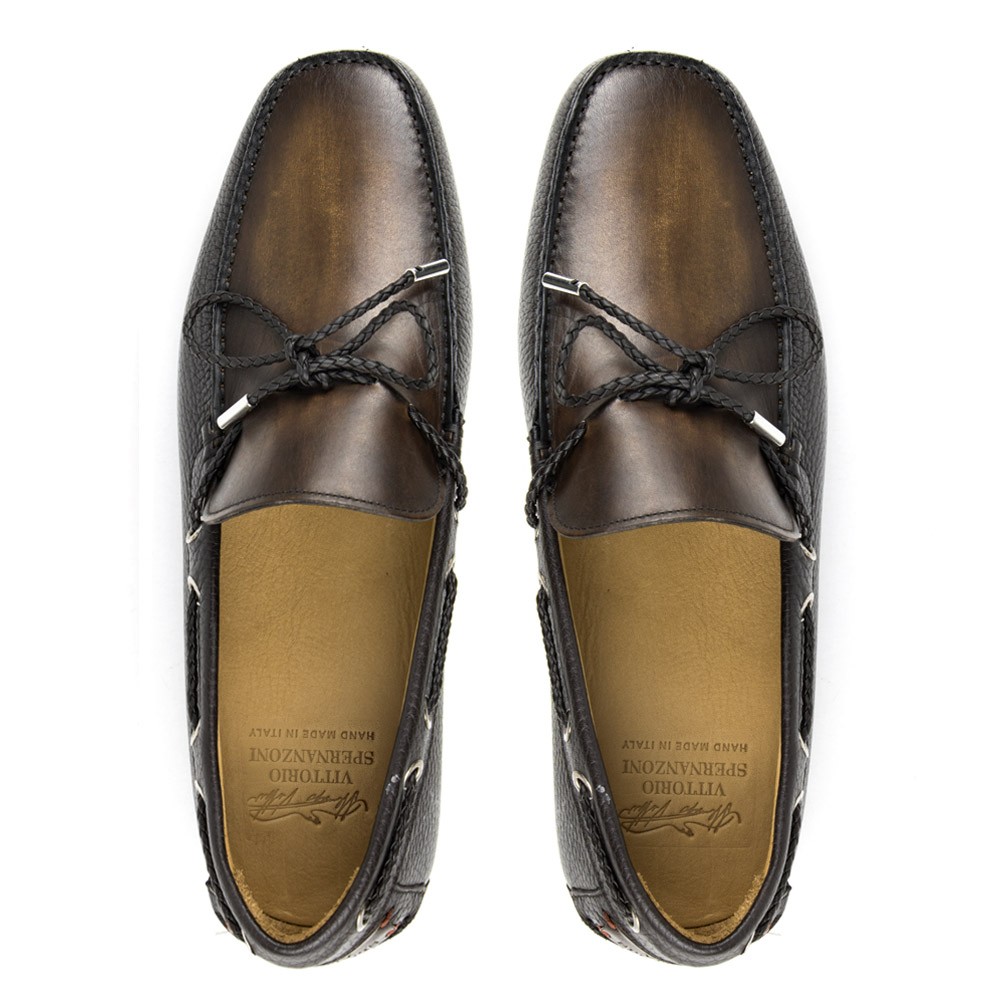 The driving shoes are made of soft leather with antique hand-colour finish. The rubber sole provides extreme comfort. The details on the woven leather tie and laces make the drivers modern and elegant.