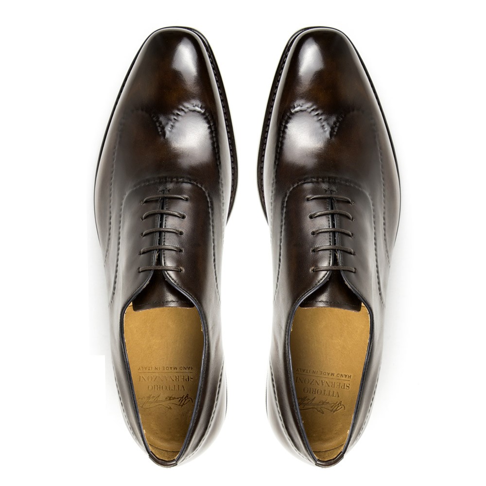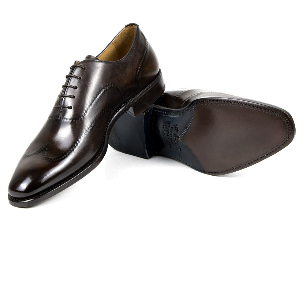Lace-up oxford shoes in hand coloured espresso leather with hand-stitching on the upper. Leather sole and Goodyear Welted construction make the piece especially comfortable.