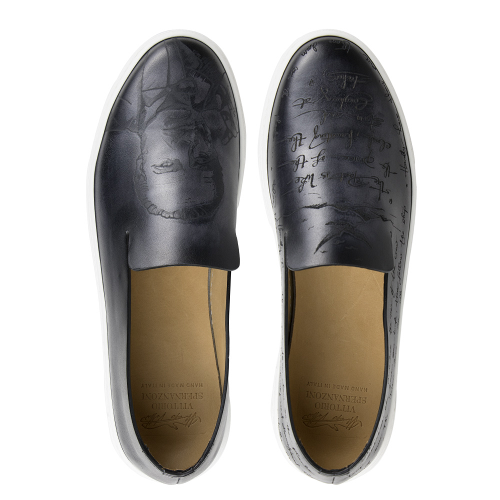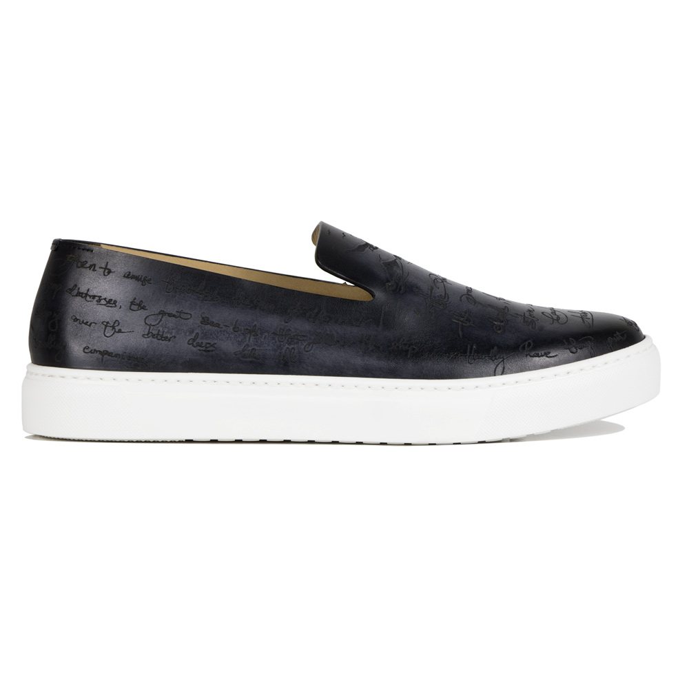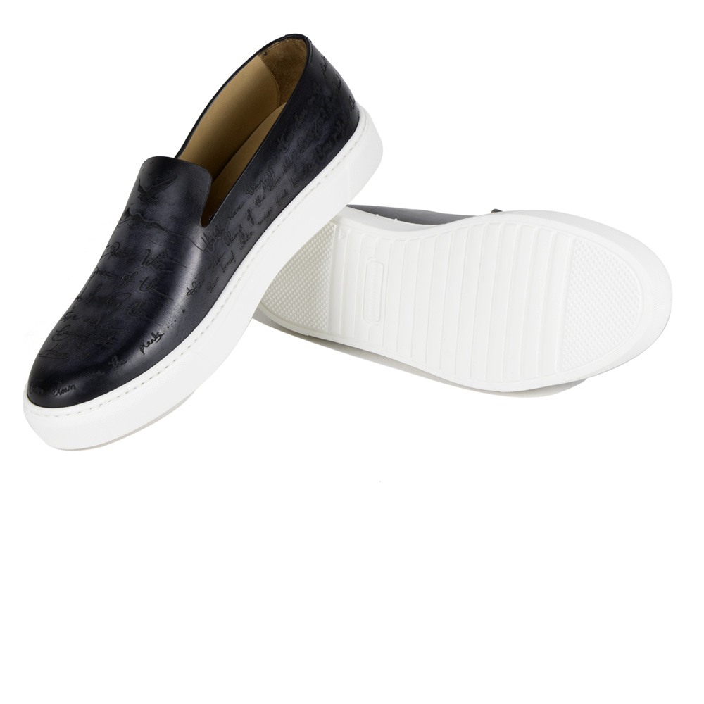 Slip-on in black calfskin leather, engraved and entirely handmade antiqued. Rubber sole and AGO construction. The sporty design and refined makes this versatile sneaker ideal for casual wear. Made in Italy.