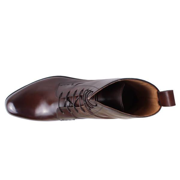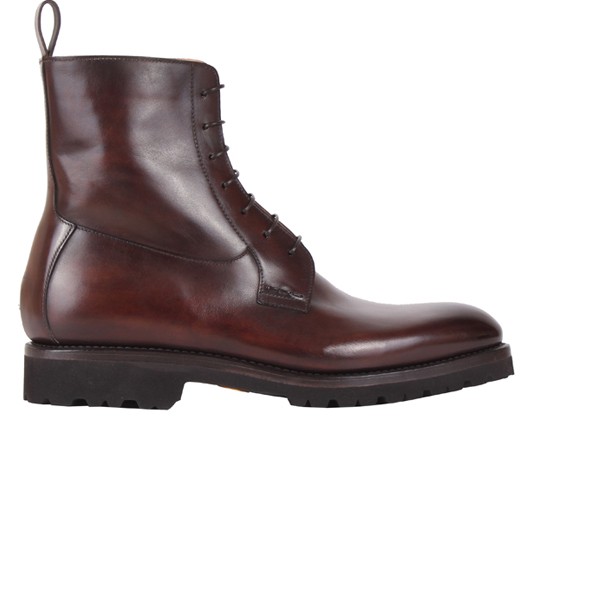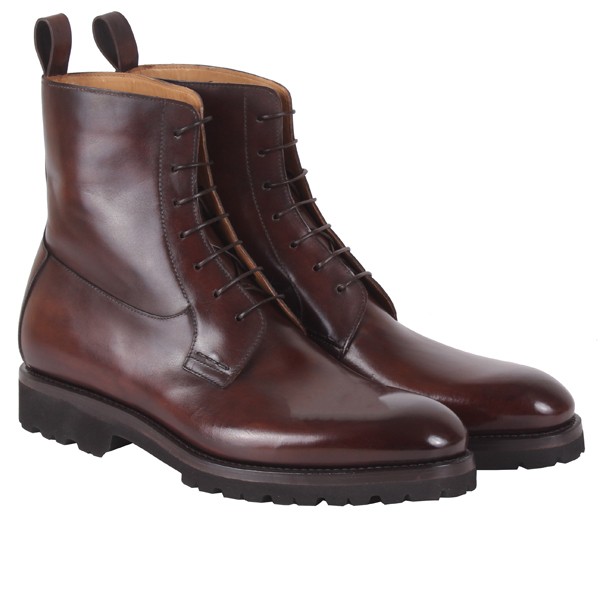 The boot has a contemporary style with soft and rounded design made of soft leather with hand-colouring and hand-polishing in espresso colour. Leather sole constructed with Goodyear Flex technique.